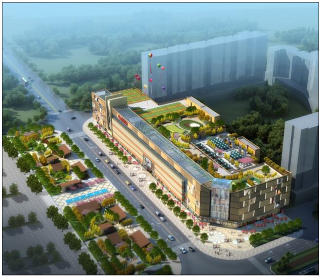 本方案设计面积为16000平方米,其中分为三块地,一块地为一层街边绿地公园,一块为商业四层屋顶花园,一块为商业五层屋顶花园。 一层街边绿地公园以自然生态为主要表达方式,在其中布局部分小商业建筑,建筑面积在500平方米以内,一层街边绿地公园是衔接景观豪庭商业建筑和三乡镇市民广场过渡地段,目的是为乡镇市民提供一处休闲、娱乐及小商业的绿地空间。